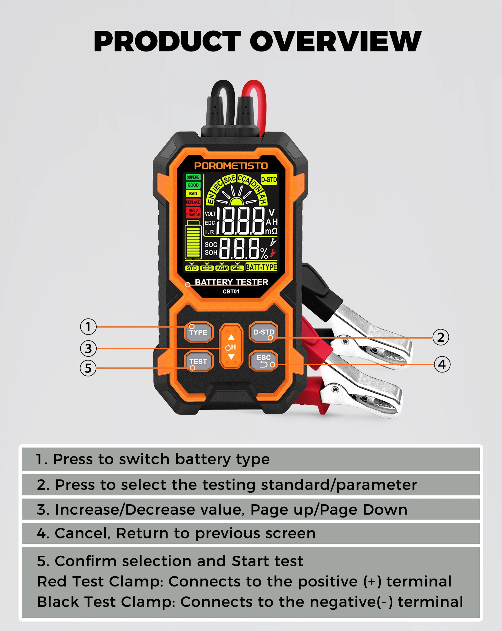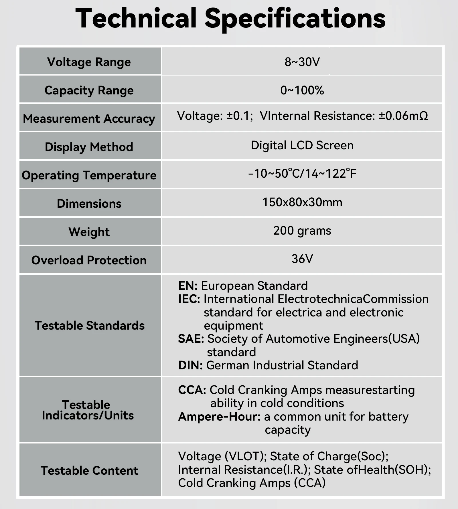 - Tests battery health, voltage & capacity